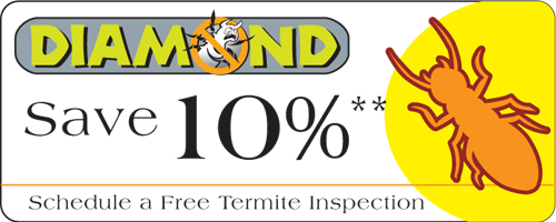 ** Offer is contingent upon an inspection of property, state of residence, presence of termite activity and construction type. Inspection and approval from Diamond Pest Control is required. Valid only at participating locations. This offer is not valid if you have a current Diamond Pest Control Termite Plan. Excludes drywood termites. Offer must be presented at time of purchase to be eligible for discount. Certain limitations, restrictions and conditions apply. Offer is void if transferred and where prohibited. Any other use constitutes fraud. Cash value 1/100 of 1 cent. Offer expires 30 July 2009.
