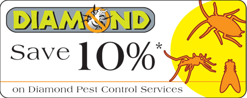 ** Offer is contingent upon an inspection of property, state of residence, presence of termite activity and construction type. Inspection and approval from Diamond Pest Control is required. Valid only at participating locations. This offer is not valid if you have a current Diamond Pest Control Termite Plan. Excludes drywood termites. Offer must be presented at time of purchase to be eligible for discount. Certain limitations, restrictions and conditions apply. Offer is void if transferred and where prohibited. Any other use constitutes fraud. Cash value 1/100 of 1 cent. Offer expires 30 July 2009.